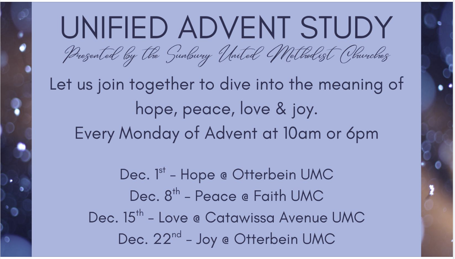 We are joining with our sister UM Churches in Sunbury for an Advent Study. Sessions are scheduled for Mondays, 10:00 am and 6:00 pm, at different locations. Everyone is welcome to participate.